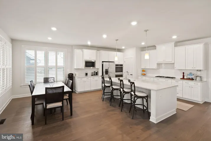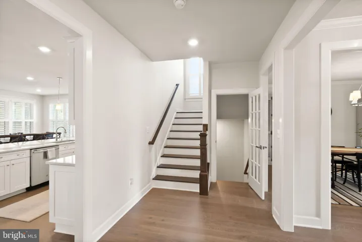 Step inside to find gorgeous LVP flooring throughout the main level, where a bright open concept kitchen and family room create the heart of the home. The chef’s kitchen features quartz countertops and on a huge island, a five-burner cooktop, double oven plus built-in microwave, classic white soft-close cabinetry, and elegant finishes. French doors lead to a private office and also open to the basement, while the formal dining and living rooms add timeless charm. A mudroom and arrival center provide everyday convenience.