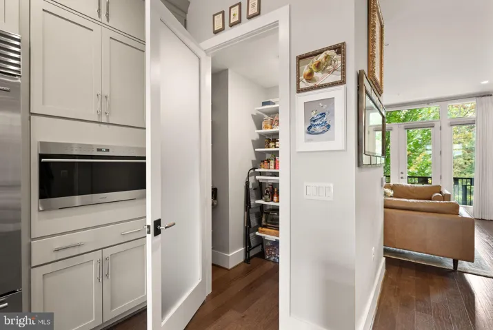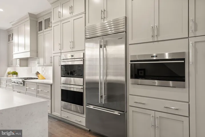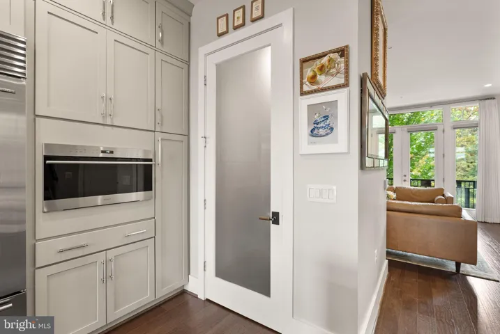 The main level is the heart of the home, centered around a breathtaking chef’s kitchen featuring a Wolf 6-burner gas cooktop, Sub-Zero refrigerator and wine fridge, Wolf double oven and microwave, quartz countertops, full-height cabinetry, and an oversized island perfect for gatherings. A walk-in pantry with custom shelving and a stylish dry bar featuring the Sub-Zero wine refrigerator in the dining room enhances the space for effortless entertaining. The dining area is generous in scale, ideal for hosting family dinners or festive celebrations. The deck off the kitchen and dining room offers another relaxing and charming space for this home. In the adjoining family room, a linear gas fireplace with a feature wall and flanked by custom shelving creates a warm, modern space. Soaring ceilings and walls of windows overlook the wooded park, filling the home with light and serenity.