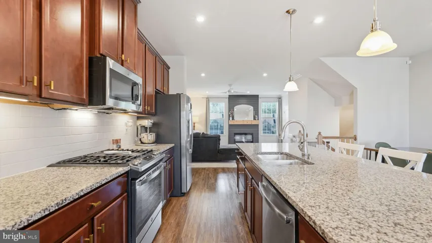 The main level showcases a gourmet kitchen with an expansive center island, stainless steel appliances, modern hardware, and an added butler’s alcove, the perfect setup for entertaining or everyday living. Step outside onto the Trex balcony off the kitchen and enjoy your morning coffee or a relaxing evening breeze. Throughout the home, you’ll find oak staircases with open bannisters, LVP flooring, and an inviting electric fireplace with a custom-built hearth, adding warmth and style to the main living space.