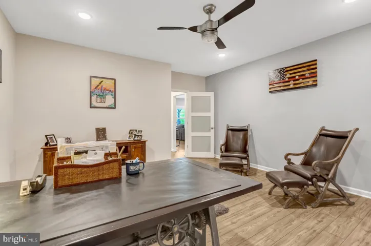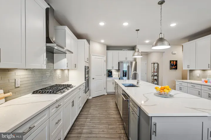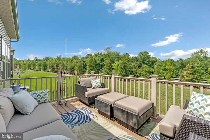 The main level features a serene primary suite with a spa-inspired bath (dual vanities, linen closet, oversized dual-head shower), a separate guest/in-law suite with retractable barn-door entry and private full bath, and a flexible sitting room/home office. The chef’s kitchen anchors the home with a striking 11-ft island, soft-close cabinetry, pull-out drawers, and premium finishes, perfect for entertaining or easy mornings. A sunny dining area and light-filled sunroom open to an expanded Trex deck for relaxed outdoor living.