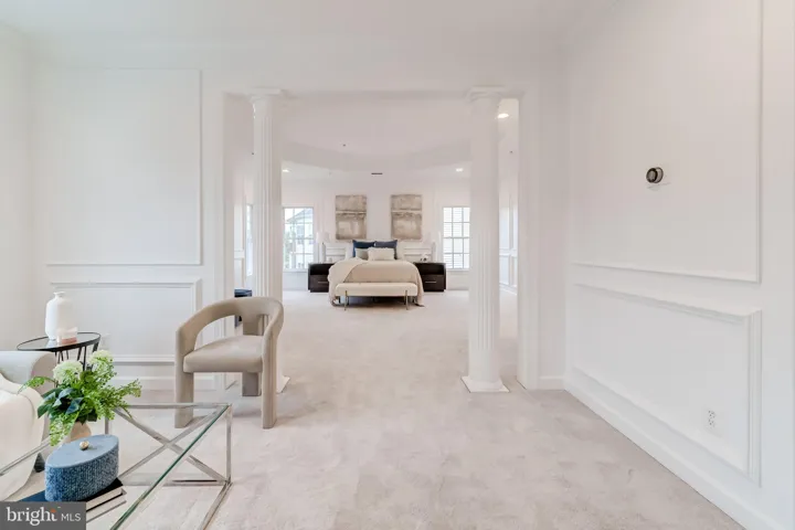 Upstairs, the lavish primary suite is a true retreat, featuring a sitting area, tray ceiling detail, and a luxurious en suite bathroom with dual vanities, an oversized glass shower, and a soaking tub. The impressive walk-in closet spans 20 feet, offering an abundance of space and organization. Three additional bedrooms, each with access to beautifully appointed bathrooms, complete the upper level.