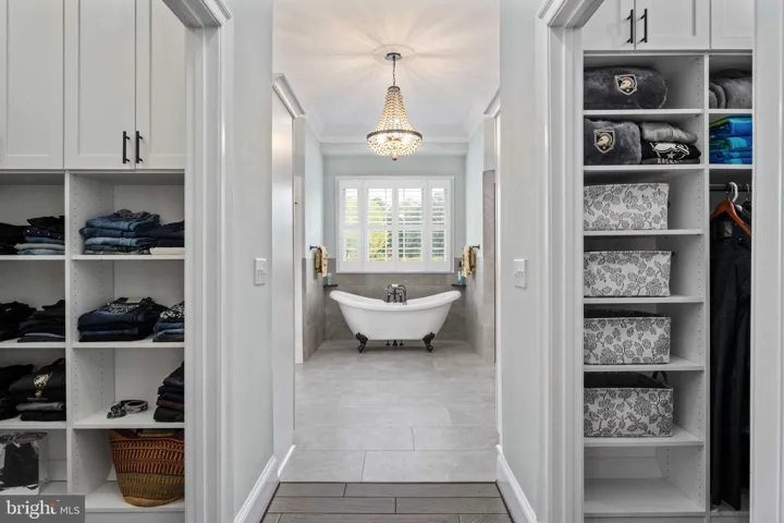 The main-level primary suite boasts tray ceilings, dual custom closets with built-ins, and a spa-inspired en suite featuring a clawfoot tub, walk-in double shower, dual vanities, and a bidet. Upstairs, three generous junior suites each offer custom cabinetry and private, well-appointed bathrooms.