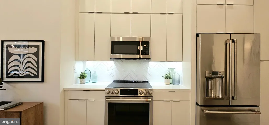 The kitchen is a true highlight, offering a large waterfall island with seating for four, premium Café appliances, quartz countertops, a white herringbone backsplash, and tall, custom cabinetry.