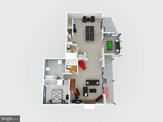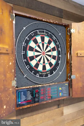 The lower level expands the living space with a second living room and fireplace, a game room equipped with a ping pong table, dart board, and foosball table, plus a walkout patio with views. A fourth bedroom and full bathroom are also located on this level, along with a laundry area that includes a washer, dryer, and utility sink.