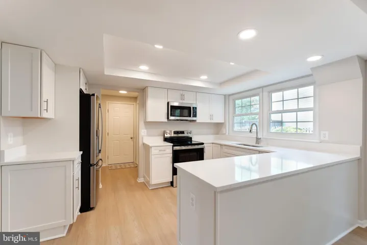 The main level features brand-new luxury vinyl plank flooring throughout, creating a cohesive and contemporary look. The spacious kitchen shines with all-new white cabinetry, sleek quartz countertops, and a stainless steel appliance package. A large peninsula island provides ample prep space and additional storage, while the adjacent breakfast room offers a bright, airy spot for casual dining.