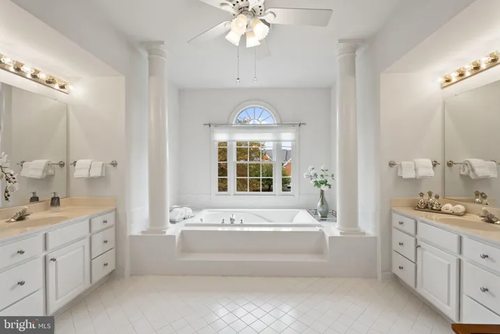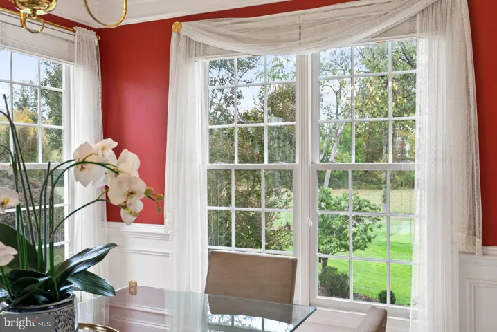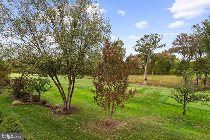 This idyllic residence offers over 4,800 square feet of living space, featuring five bedrooms and four and a half bathrooms. The main level welcomes you with a gracious entry foyer with a pristine hardwood staircase and hardwood flooring flowing throughout. The gourmet kitchen is a chef’s delight, showcasing high-end stainless steel appliances, granite countertops, a custom-made spacious island with seating for four, and a bright breakfast area that opens to the airy family room with soaring 10-foot ceilings and a white marble gas fireplace. Off the kitchen and breakfast area, step through the French door to the expansive elevated rear deck equipped with stairs down to the yard. The deck is perfect for enjoying your morning coffee surrounded by nature or entertaining guests while watching as the sun sets. Also visible from the deck are the nearby 5th & 16th holes! A great spot to sit and enjoy watching the golfers play! Also on the main level are the formal living room with bay window, and dining room with double window overlooking the golf course, a private office with French doors – ideal for working from home, and a mudroom leading to the two-car garage.