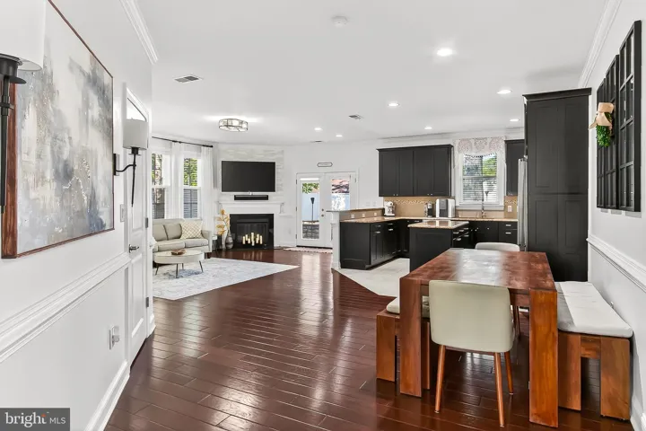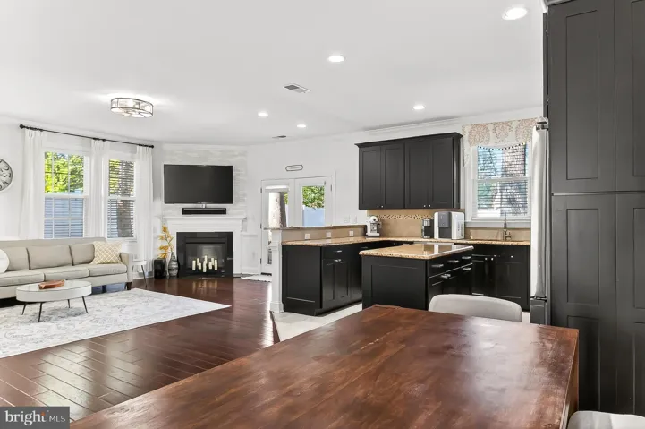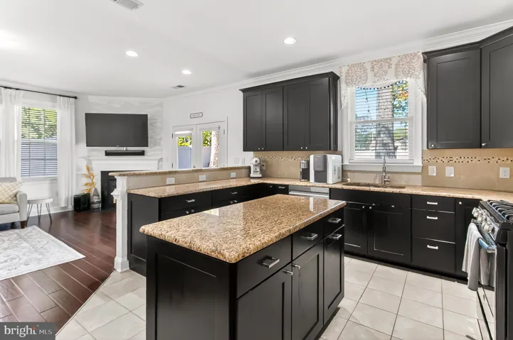 Inside, an open floor plan unfolds across elegant travertine tile and rich hickory hardwoods, with recessed lighting and designer finishes enhancing every space. A generously sized one-car garage seamlessly connects to the main living area through a thoughtfully designed mudroom. The living room is bathed in natural light from triple windows and anchored by a cozy corner fireplace, creating a warm and airy atmosphere. Adjacent, the dining area flows seamlessly into a gourmet kitchen that will delight any culinary enthusiast. Granite countertops, handcrafted cabinetry, a designer backsplash, and stainless-steel appliances—including a gas range and French door refrigerator—combine to elevate both form and function. A center island and peninsula breakfast bar offer ample prep and gathering space, while French doors lead to a private backyard complete with a paver patio, gardener’s shed, and privacy fencing—perfect for alfresco dining, entertaining, or quiet relaxation. Back inside, a powder room with a chic pedestal sink complements the main living areas.