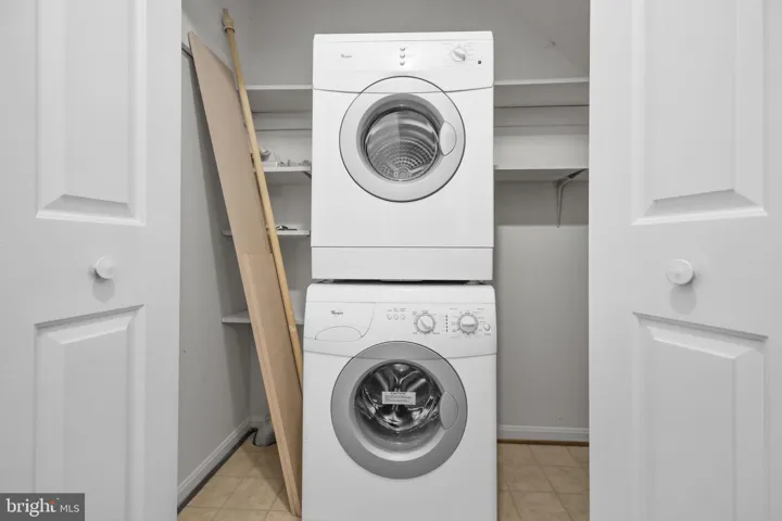 The laundry area is on the main level and features a stackable washer and dryer, the water heater, and additional storage space under the stairs. You can store your cleaning products and tools here and out of sight!