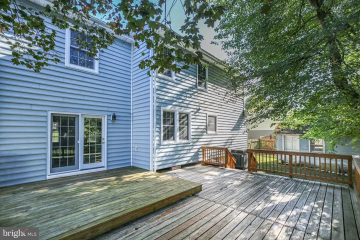 The kitchen offers ample cabinet and prep space, with a sunny window overlooking the backyard and a cozy breakfast area ideal for casual dining. The family room invites relaxation with its brick wood-burning fireplace and hearth—perfect for cooler evenings—and French doors that open to a spacious two-tiered deck shaded by mature trees, creating a tranquil outdoor retreat.