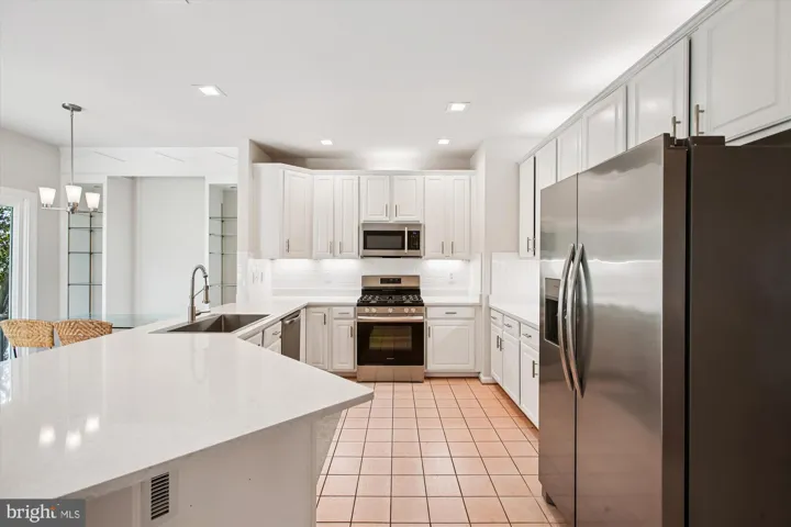 The entirely renovated gourmet kitchen is equipped with high-end stainless steel appliances, including a four-burner range (2024), refrigerator (2024) and Dishwasher (2025) along with a chef-friendly peninsula with bar-style seating – – Perfect for casual dining and entertaining.