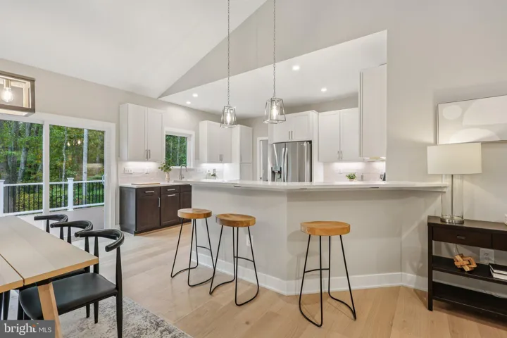 The gourmet kitchen is a showpiece in itself, featuring 42” white dovetail soft-close cabinetry, seamless quartz countertops, high-end stainless-steel appliances, and an oversized peninsula with bar seating—perfect for gathering with family and friends.