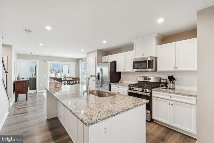 Inside, low-maintenance luxury vinyl plank flooring extends across the open main level, uniting the living, dining, and kitchen spaces with seamless flow. The gourmet kitchen is a true centerpiece, featuring granite countertops, designer cabinetry, added backsplash, and modern fixtures—all opening to spacious living and dining areas ideal for entertaining or everyday comfort. From the dining area, step outside to the covered patio, a peaceful retreat for al fresco dining or unwinding in the shade.