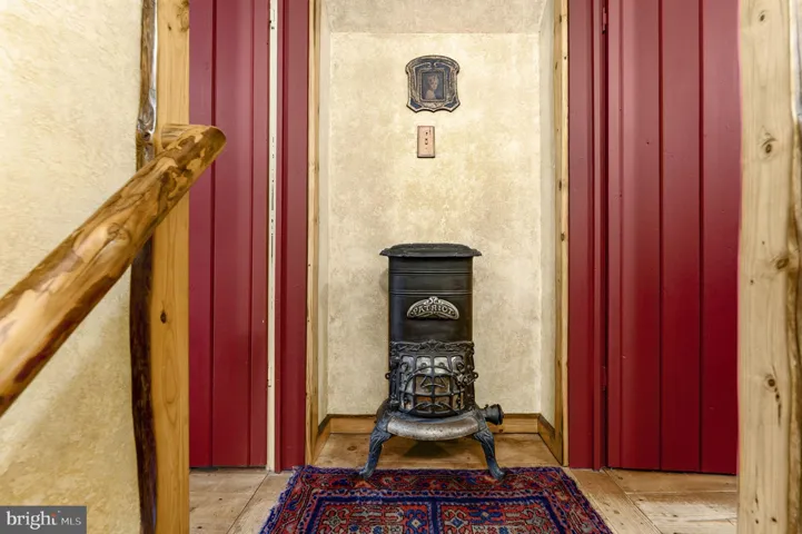 Inside, the home radiates a cozy, soulful atmosphere. A wood-burning stove anchors the living space, complementing the tactile beauty of natural materials underfoot. Thoughtfully integrated in-wall speakers provide a subtle modern touch, blending seamlessly with the home’s heritage aesthetic. The open layout feels intimate yet functional, perfect for quiet evenings by the fire or entertaining in comfort and style.