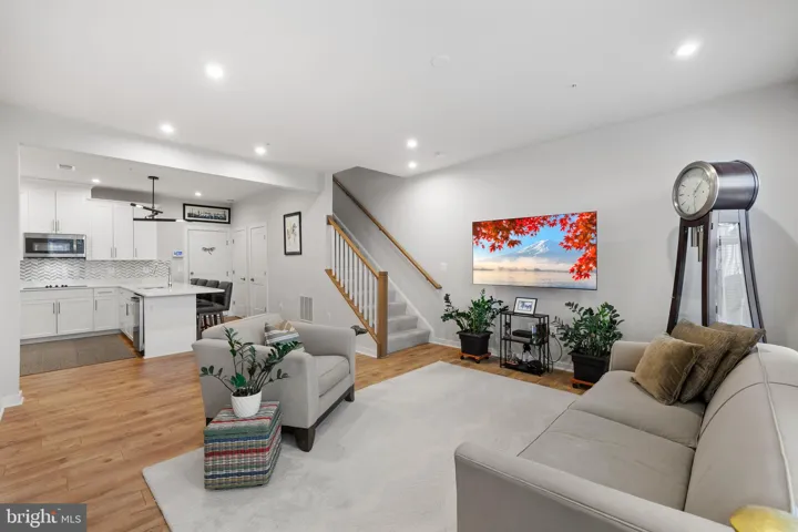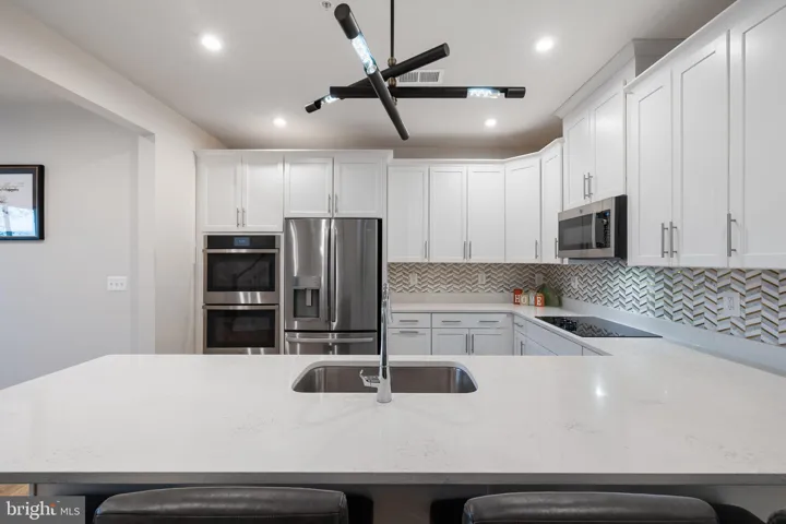Walk in and you’ll immediately notice the open layout. The kitchen is a total standout—with double ovens, quartz counters, a separate cooktop, and a custom backsplash that makes the whole space pop. Tons of cabinet space and bar seating make it both beautiful and super practical.