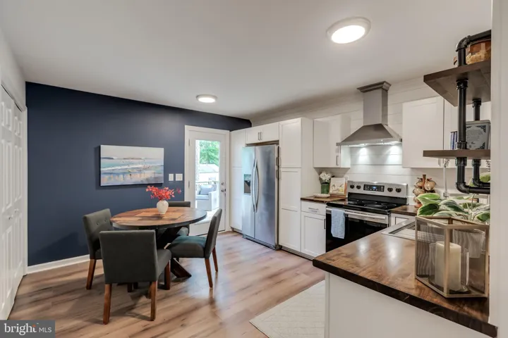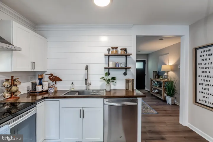 Kitchen was renovated with shaker cabinets, stainless steel appliances, butcher block counters and features both a built in pantry & small walk in pantry.