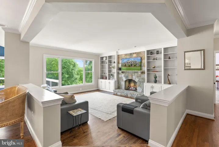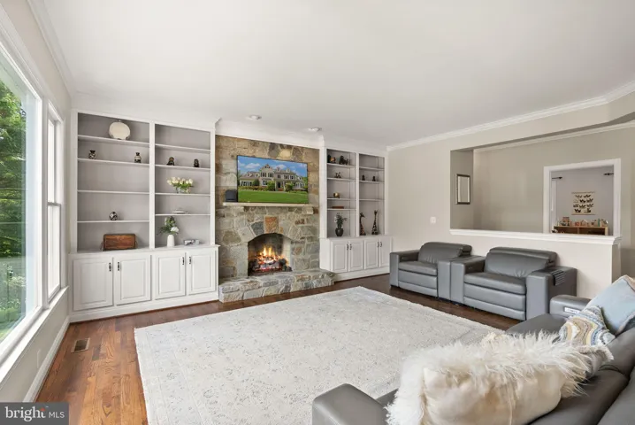 The main level is anchored by a first-floor primary suite with a renovated bath and custom walk-in closet. A gourmet kitchen with Jenn-Air appliances, a walk-in pantry, and a sunlit breakfast room opens seamlessly to the spacious family room with custom built-ins and a gas fireplace. A private home office, formal dining areas, and a well-planned mudroom enhance both functionality and flow.