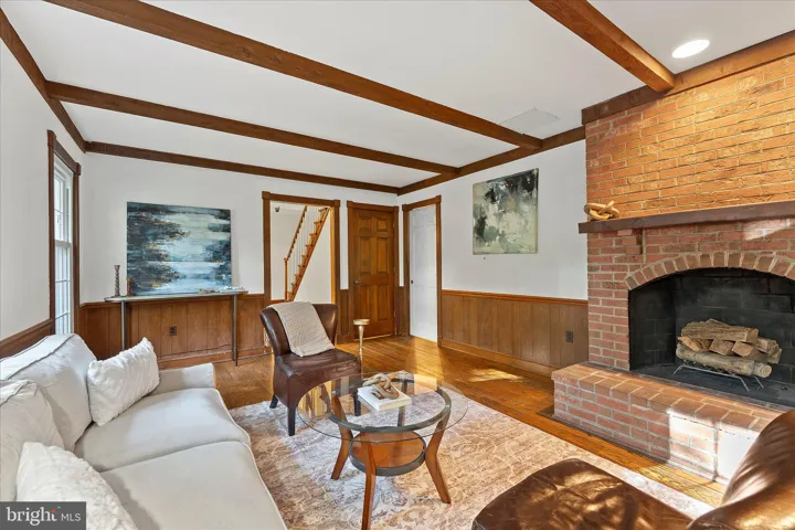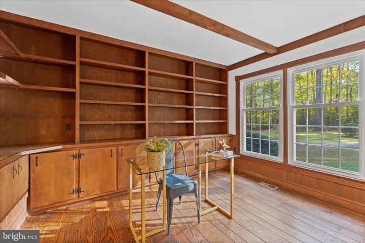 The main level welcomes you with a grand double-door foyer, gleaming hardwood floors, and spacious formal rooms perfect for entertaining. The elegant living room features a brick wood-burning fireplace, while the dining room showcases a charming bay window with sweeping views of the wooded landscape and a built-in corner cabinet. The large family room boasts a full brick wall fireplace with a wood box, timbered ceiling, and an entire wall of custom built-ins—an inviting space for gatherings. The well-appointed kitchen offers abundant cabinetry, a pantry, cooktop, wall oven, built-in microwave, refrigerator, dishwasher, and an eat-in breakfast area with ample counter space.