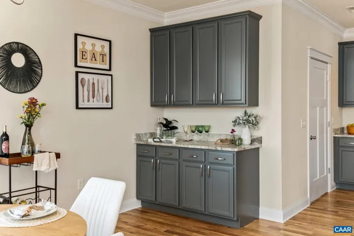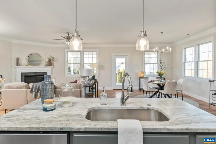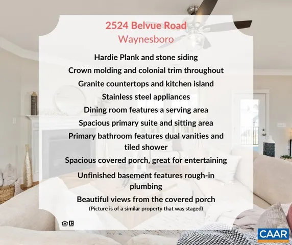 Enjoy one-level living with this custom built home. Meticulously crafted, every detail has been thoughtfully planned with you in mind. Beautiful crown molding throughout the main living space, 9′ ceilings, custom colonial trim, gorgeous hardwood floors, and so many more special touches await you. This house features a warm and inviting flow, with convenience and functionality in mind. From the welcoming front porch, the main living space is open with comfortable flow from room-to-room, and the spacious covered back porch is great for entertaining! The kitchen features plenty of cabinetry and counter space, a large island with sink, and granite countertops. The dining room features a serving area that is convenient to the kitchen. The back covered porch is cozy and welcoming, whether you enjoy entertaining or sitting in the sunshine and looking at the views. The primary suite features a sitting area and a primary bath with a large tiled shower. The bonus room can be used as an office, play area, or for storage. The walkout unfinished basement has rough-in plumbing. See it today! Note: Property is under construction! Interior pictures with staging are from a similar property, pictures are labeled. Completion date expected by 11/30.,Granite Counter,Painted Cabinets,Fireplace in Living Room