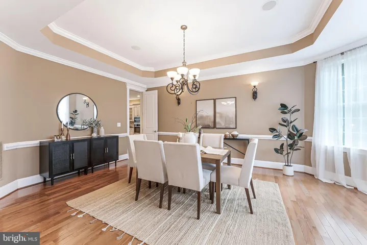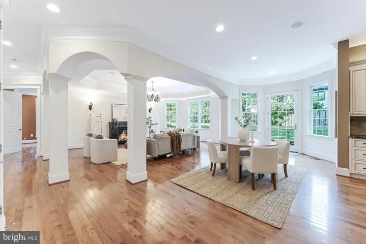 A grand two-story foyer with a curved staircase sets the tone for the sophisticated interior. Formal living and dining rooms at the front of the home are filled with natural light from large windows, creating inviting spaces for entertaining.