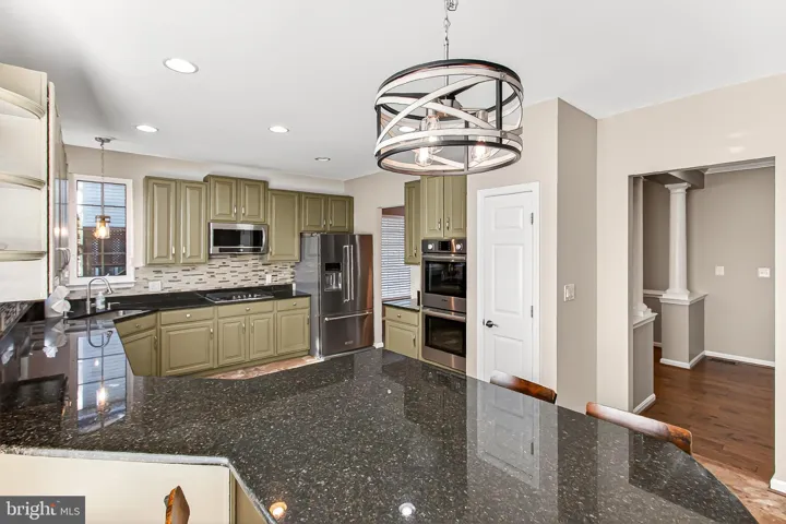 Moving toward the back of the home, the layout transitions seamlessly into the heart of everyday living. The kitchen features stylish cabinetry, modern stainless-steel appliances, and gleaming granite countertops, including a large peninsula. From here, the home opens into the spacious family room, where a cozy fireplace becomes the natural focal point. Soft natural light fills the room and French doors open to a beautiful deck complete with a shaded gazebo—perfect for lounging or dining outdoors—overlooking a fenced yard and stone patio with a built-in fire pit. The backyard offers both privacy and connection to open green space beyond, creating a peaceful backdrop for entertaining.