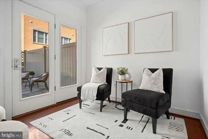 On the main level, discover a sophisticated formal living room with floor-to-ceiling windows and a cozy fireplace that opens to a modern dining room. The updated kitchen is a true showpiece, complete with granite countertops, a spacious island with new pendant lighting, upgraded stainless-steel appliances including a gas range and vented hood, dark wood cabinets with honed black hardware and a designer tile backsplash. Just off the kitchen, a charming breakfast nook with French doors that open to a private fenced patio—perfect for relaxing or entertaining outdoors. A powder room completes this level.