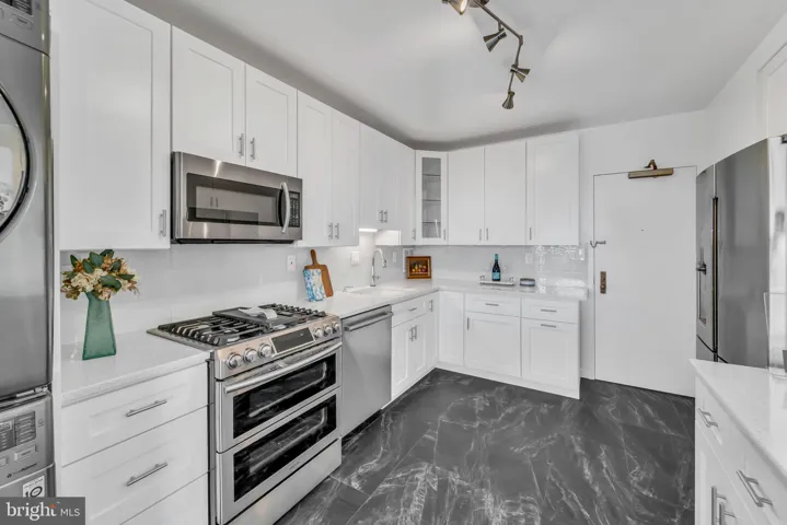 The open-concept kitchen (remodeled in 2020) is a true showpiece with Cambria Whitney quartz countertops, Snow Haven White wood cabinets (J&K Cabinetry), and premium stainless-steel appliances, including a Samsung Chef Collection refrigerator, Samsung dual-door range and microwave, and Bosch 500 Series dishwasher. The kitchen also features Montalcino Jasper Black porcelain tile flooring, a touchless Delta faucet (battery-powered, recently replaced), and a polished nickel pendant lighting trio. A windowed bar seating area offers a perfect spot for morning coffee or casual meals, enhanced by a modern overhead sink light.