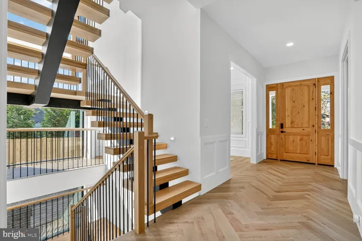 Inside, you’ll find Sub-Zero and Wolf appliances, custom hand-built cabinetry, and ¾-inch wide-plank hardwood floors on three levels. A dramatic open-riser white oak staircase with black steel rails connects each floor, anchoring a layout that’s as functional as it is striking.