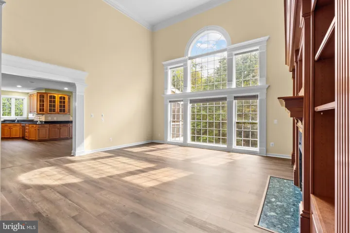 The elegant main level features a grand two-story foyer with a striking chandelier, a formal living room with a bay window offering scenic side views, and a dining room with a butler’s pantry. The gourmet kitchen boasts premium appliances, accompanied by a sunlit breakfast room and a spacious laundry room equipped with a washer, dryer, and a large utility sink. The expansive two-story family room showcases a wall of windows overlooking the private backyard, vaulted ceilings, a fireplace, and exquisite custom built-ins. A versatile main-level workspace behind double French doors, with cloakroom access, adds flexibility.