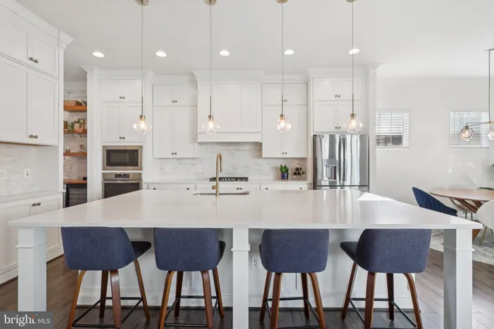 The kitchen is a true centerpiece: crisp white cabinetry, expansive quartz countertops with bar-stool seating, stainless-steel appliances, designer backsplash, upgraded pendant lighting above the island, a built-in coffee bar, and a generous walk-in pantry. Adjacent is an eat-in breakfast room, while a custom mudroom with shiplap and built-in cabinetry delivers functional style.