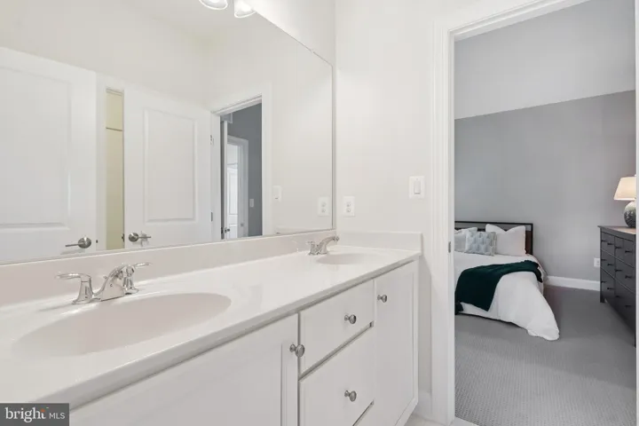 On the upper level you’ll find three secondary bedrooms — one with its own en-suite bath and the other two sharing a Jack-and-Jill bath. The primary suite is a retreat unto itself: generous closet space with custom shelving and a spa-inspired bath featuring dual vanities and a frameless glass shower with upgraded tile.