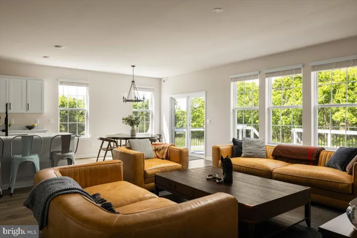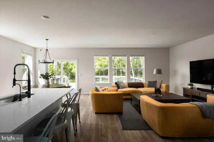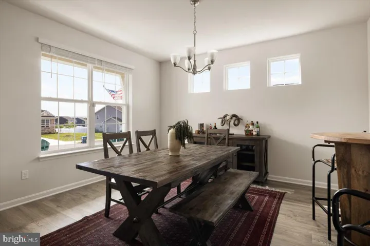 The main level includes a convenient bedroom and full bath—perfect for guests or multigenerational living. The open-concept design connects the sleek white kitchen, dining area, and family room filled with natural light from expansive windows. The kitchen features a seated island, stainless steel appliances, and a cozy breakfast area overlooking the family room. Enjoy more formal meals in the stately dining room.