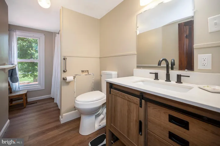 The Farmhouse features approximately 2,200 sq. ft and has a glass & brick enclosed three-season front porch of nearly 350 sq. ft. Although the home was originally built in 1870 and expanded and renovated in 1927, many recent updates have been made to blend modern conveniences with old school rustic charm. With two updated bathrooms, a newer metal roof, 2 newer mini-split units, re-modeled Kitchen, the home still has the charm of original pine floors, wood-beamed ceiling in the Main living area, and the feel of a time-gone-by. The entry room of the home is currently used as the foyer and dining room. The large primary bedroom is on the main level and is adjacent to the living room. The first-floor bathroom has a tiled walk-in shower, and the large country kitchen offers a small breakfast area. An enormous mudroom and laundry room is just off the kitchen. Upstairs has a large bedroom, updated bathroom and an additional smaller bedroom with a connecting room which currently is used as an office. There is a large deck off this area providing gorgeous views of the back property.