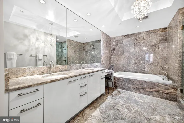 The generous primary suite offers a walk-in closet with custom built-ins, custom blackout drapes, and a spa-like marble bathroom complete with dual vanities, Dornbracht Faucets, a separate 6-foot Jacuzzi soaking tub, and a walk-in shower.