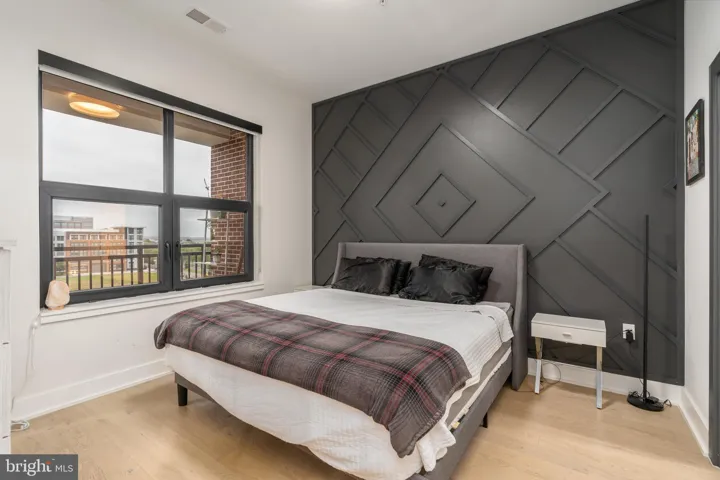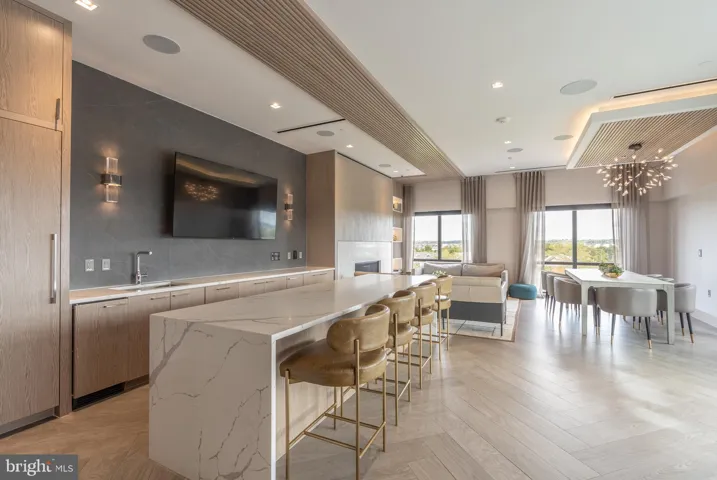 Designed for both function and flair, the chef’s kitchen is a statement in European elegance. It features imported Italian cabinetry, a generous quartz waterfall island, integrated Bosch stainless steel appliances—including a panelized refrigerator/freezer—and abundant storage throughout. Rich hardwood flooring flows seamlessly from the kitchen into a refined living and dining area, which opens to a private balcony overlooking the park, the newly opened Potomac Yard Metro, and the iconic D.C. skyline.