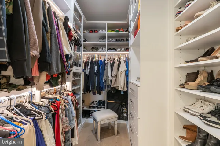 The spacious primary suite offers a serene retreat, complete with a custom walk-in closet by Capitol Closet Design and a spa-inspired en-suite bath featuring a frameless glass shower, Waterworks fixtures, and an LED-lit vanity mirror. The den—ideal as a home office, library, or guest space—features custom wall paneling that adds both warmth and sophistication.