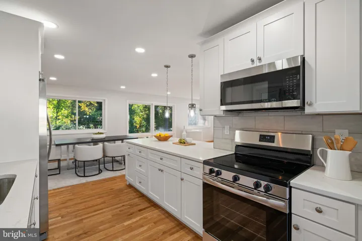 Tucked away on a quiet street, this completely turn key home boasts a full renovation in addition to its top notch location. 4 bedrooms and 3 full baths on 2 finished levels. Step inside to find gleaming hardwood floors flowing throughout the open concept main level complete with walls of windows. The gourmet eat in kitchen features modern white shaker cabinetry, stunning Premata quartz counters, a custom tiled backsplash and new stainless steel appliances. The eat-in nook with its large front window is perfect for that morning coffee! Just off the kitchen you have a large dining and living room. Bright new recessed lighting and ample oversized windows allow for an abundance of natural light and stunning views of the private backyard oasis. Make your way down the hall to find two spacious guest bedrooms each featuring new lighting and hardwood flooring with loads of natural light. Across the hall is a fully renovated bathroom with a modern vanity and a custom tiled shower and bath. The 3rd bedroom, a main level primary suite is a true retreat! Sitting on the rear of the home, this bedroom features the same hardwood flooring along with views of the backyard. The en-suite bath is a true show stopper with a beautifully tiled shower. As you make your way down to the fully finished walkout basement, the oversized rec room features a wood burning fireplace, fresh carpet, a brand new wet bar, recessed lighting and a sliding door walk-out to the flat and spacious backyard. Enjoy entertaining inside or outside on the newly poured large concrete patio! Back inside, you’ll find a third fully renovated full bathroom and the bright and sunny fourth bedroom, complete with egress window. The laundry and storage room with a separate entrance to the outside can also be found down here. Brand new 2025 roof, 2022 Lennox HVAC system, 2025 water heater, newer vinyl windows.