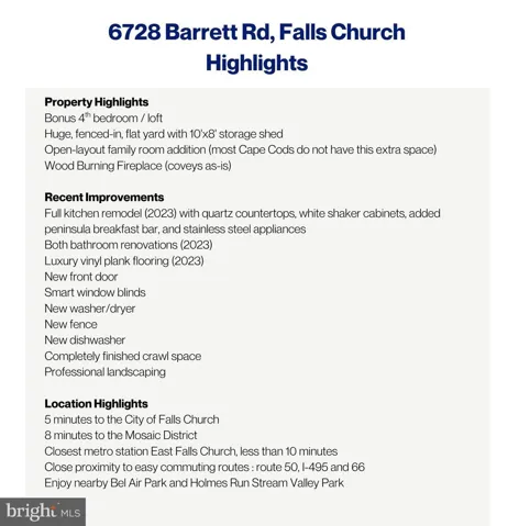 Fall in love with this beautifully updated 3 Bed, 2 Bath, Cape Cod featuring bonus 4th bedroom, open-layout family room addition, huge flat fenced-in backyard and modern sleek finishes throughout. With a refreshing, bright, airy aesthetic, this home is completely renovated from top to bottom and has been meticulously maintained. All of this in a quiet, residential neighborhood 5 minutes to countless shops and restaurants and situated for easy commuting routes. Welcome to the cutest house on the block! Open Houses this weekend! *What makes this home stand out?* An exceptional floor plan that includes a front living room with white brick fireplace, leading to the spacious kitchen and open-layout dining and family room. The huge addition at the back of the home is walled with windows to allow ample natural light and flows seamlessly into the backyard. The first floor boasts two bedrooms, the second bedroom can function as a bedroom, nursery, office, or closet extension off the primary. The second floor features one bedroom, one full bathroom and a bonus loft room perfect for an office, playroom or guest room. One of the most exciting features of this property is the 7,200 sqft lot with a massive, flat, fenced in yard with spacious storage shed and new fence. This is truly an oasis that you can make into your own outdoor paradise, whether its for your garden, kids, pets, or entertaining with family and friends this backyard is a dream come true. (Recently seeded, new grass coming soon!) *Valuable Improvements* Full kitchen remodel (2023) with quartz countertops, white shaker cabinets, added peninsula breakfast bar, and stainless steel appliances, both bathroom renovations and luxury vinyl plank flooring (2023), new front door, smart window blinds, new washer/dryer, new dishwasher, completely finished crawl space and professionally landscaped. *What makes this location stand out?* Quick 5 minutes to the City of Falls Church, 8 minutes to the Mosaic District, 12 minutes to Ballston and situated perfectly for easy commuting routes. Close proximity to the East Falls Church Metro, route 50, I-495 and 66, Enjoy nearby attractions including Bel Air Park and Holmes Run Stream Valley Park. *Open Houses This Weekend* October 18th 12pm-2pm and October 19th 12pm-2pm, stop by to see this gem in person!