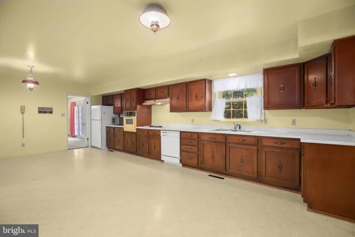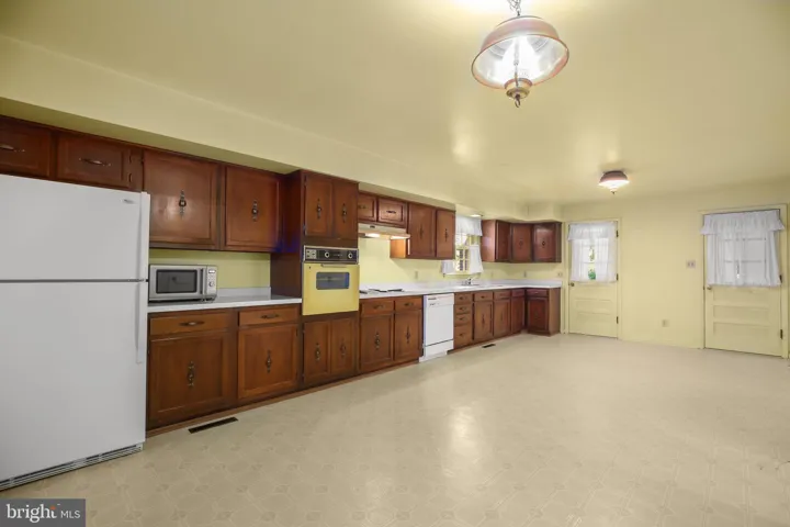 Enter the home from the covered back porch, a peaceful spot with panoramic views perfect for relaxing and watching the sunset. Inside, the oversized kitchen offers ample space for updates and is thoughtfully designed for informal gatherings. A picture window above the sink frames views of the scenic backyard, while a convenient vestibule off the kitchen includes the laundry room, pantry, and a half bath.