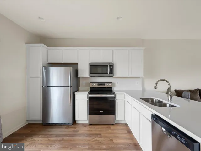 The main level features a bright, open-concept layout with a modern kitchen showcasing quartz countertops, stainless steel appliances, and a spacious island. The kitchen flows seamlessly into the dining and living areas, creating an ideal space for both daily living and entertaining.