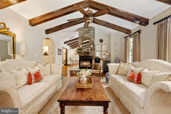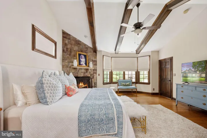 The primary suite is a serene retreat, featuring a cathedral ceiling with rustic beams, a luxuriously updated en suite bath, and multiple walk-in closets. Three additional main-level bedrooms offer hardwood flooring, custom window treatments, and walk-in closets, while the spa-inspired bathrooms showcase heated tile floors for ultimate comfort.