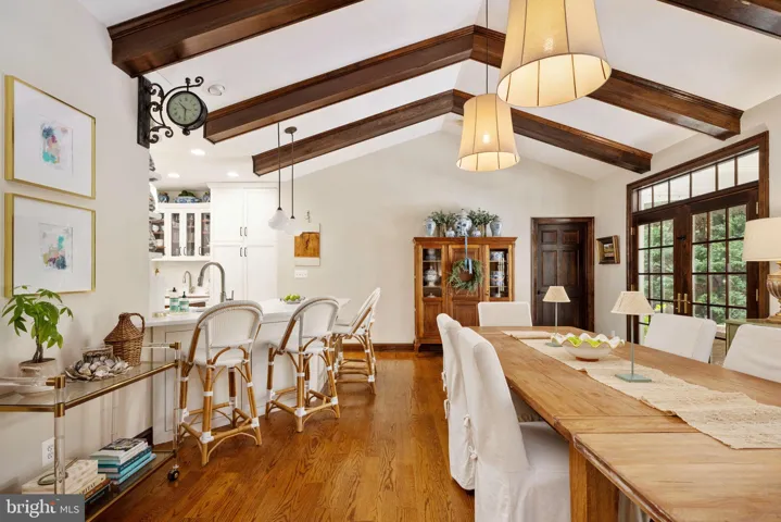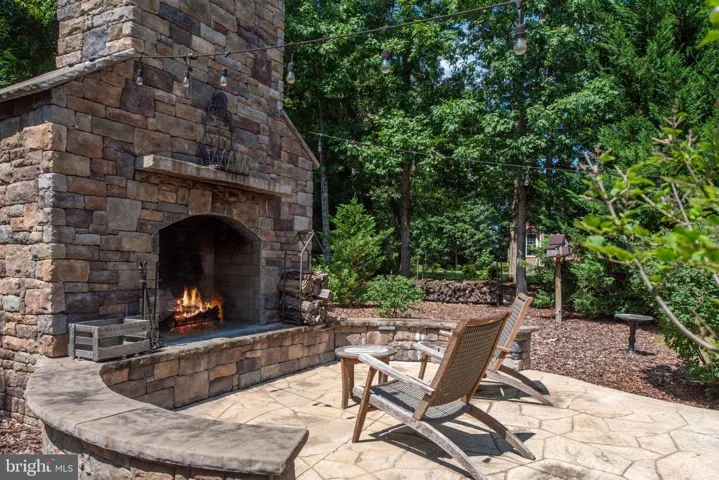 Dine beneath a cathedral ceiling with exposed beams, warmed by the ambiance of a three-sided fireplace that connects the living and dining areas in perfect harmony. A double set of French doors invites you to the covered slate porch and expansive patio, complete with a hot tub, outdoor wood-burning fireplace, and extensive hardscaping designed for year-round enjoyment.