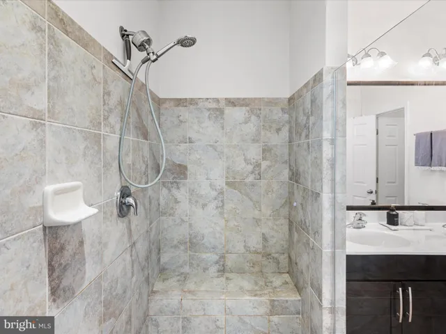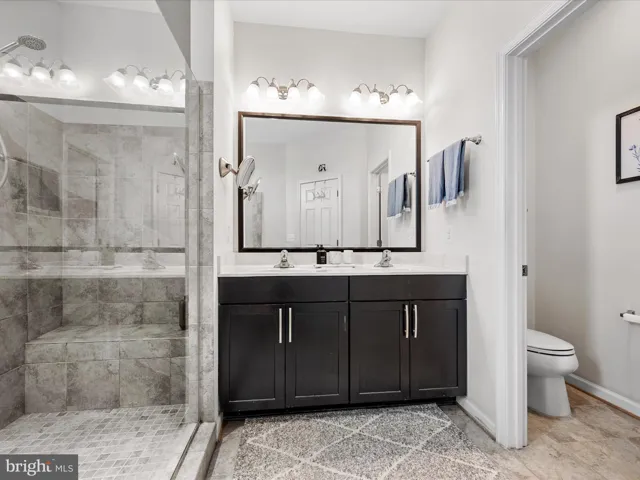 Upstairs, the primary suite features a walk-in closet with custom shelving, remote blinds, and a bath with frameless glass shower doors, granite counters, and tile flooring.