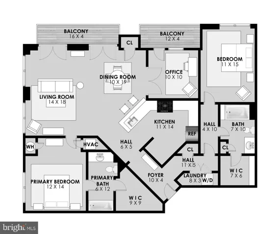 Each bedroom functions as a separate suite, complete with private bathrooms and walk-in closets, ensuring maximum privacy. The living area is bathed in natural light and boasts large windows and high ceilings, creating an open and inviting atmosphere. An open floor plan seamlessly connects the living room to the dining area, with access to a large balcony from both spaces—perfect for entertaining or unwinding after a long day. The den/office, accessed via charming French doors, also features a private balcony, making it an ideal space for work or relaxation. The modern kitchen is a chef’s delight, equipped with maple wood cabinets, granite countertops, and stainless steel appliances.