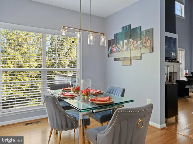 The chef’s kitchen features modern lighting and hardware, stainless steel appliances, and an L-shaped island overlooking the bright breakfast nook and spacious family room. The family room impresses with its vaulted ceiling and second fireplace, creating a warm and inviting atmosphere.