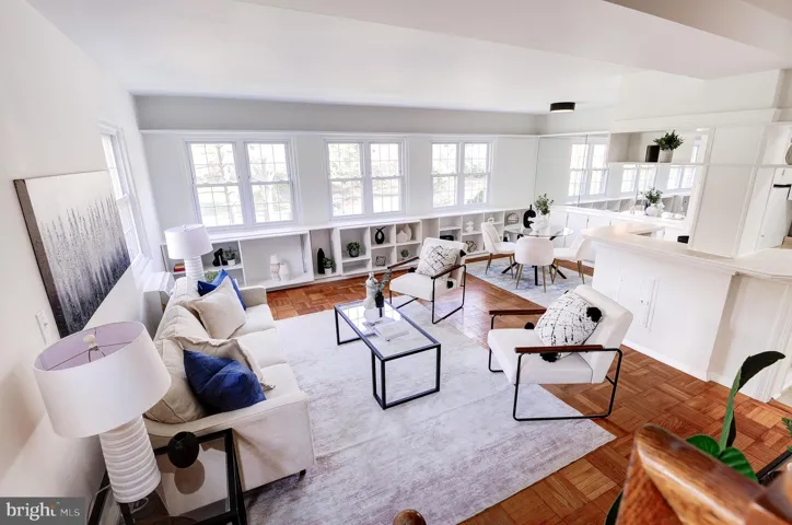 Step into a spacious living and dining area featuring a wall of windows that fills the home with natural light and highlights the stunning parquet flooring. Custom built-in shelving adds both character and function, creating the perfect backdrop for your favorite decor and books.