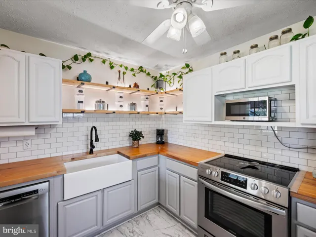You’ll instantly feel at home in the bright and inviting kitchen, complete with butcher block countertops, open shelves, and a subway tile backsplash. The space has a warm, modern feel, and all the kitchen appliances have been replaced within the past three years.