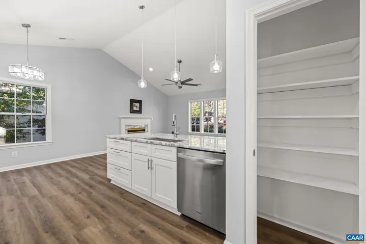Location, location, location! In the desirable Forest Lakes Subdivision, this one-level living home is tucked at the end of a cul-de-sac, with extra privacy adjacent to common areas. Relax on the covered front porch. Both the one car garage and the breakfast room open to the concrete patio in the rear, great for BBQs, which leads to an attached storage shed. This tastefully renovated rancher boasts high quality luxury vinyl plank flooring and vaulted ceilings. Both full bathrooms have all new fixtures and vanities. Eat-in galley kitchen boasts a skylight, lovely white cabinetry, granite counters, impressive granite backsplash, new stainless steel appliances, and opens to the vaulted ceiling over the large dining room – which is so large it can be used as another family room. A minute away from 2 swimming pools, miles of paved walking trails, tennis, basketball, volleyball, soccer, exercise room, 2 clubhouses, multiple ponds, community dock, playgrounds, picnic areas.,Granite Counter,White Cabinets,Wood Cabinets,Fireplace in Dining Room