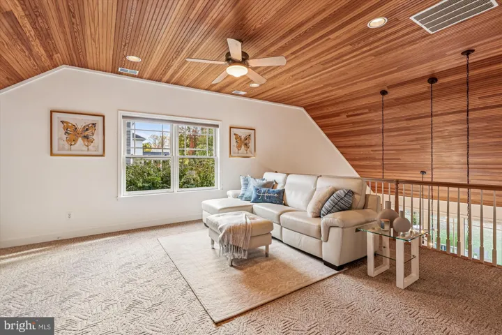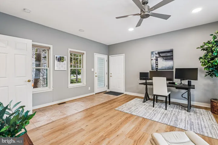 A main-level office with private exterior entrance offers flexibility for remote work, while the upper-level loft provides additional space for a second office, gym, or teen retreat. The walk-out lower level features a spacious recreation room, guest suite with adjacent renovated bath, sitting area, and abundant storage. Professionally landscaped grounds complete this tranquil retreat, offering rare privacy just steps from Vienna’s vibrant downtown.