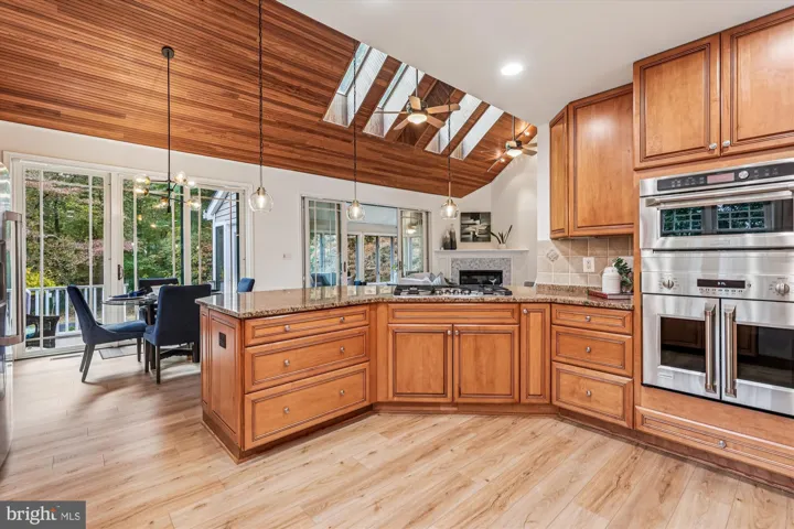 The gourmet kitchen will delight the most discerning cook, with stainless appliances, quartz countertops, 42-inch wood cabinetry, walk-in pantry, and an adjacent four-season sunroom that opens to the deck and patio for effortless indoor-outdoor entertaining. The family and dining rooms showcase vaulted wood ceilings, skylights, and panoramic windows, filling the home with natural light, warmth and pretty views.