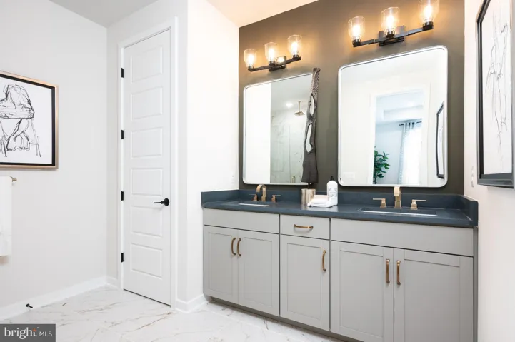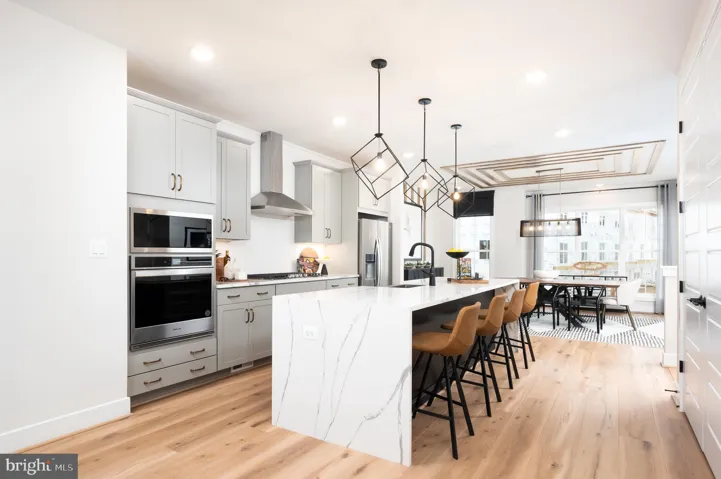 This end unit home showcases a bright, open-concept main level with a spacious great room, dining area, and a rear kitchen ideal for entertaining. The chef-inspired kitchen offers an expansive island with Calacatta Gold quartz countertops, Brellin Frost and Artisan Maple Gunny cabinets, stainless steel appliances, and gold hardware. Upstairs, the primary suite impresses with its spacious walk-in closet and a spa-like bath featuring quartz countertops. Two additional bedrooms, a full bath, and a conveniently located laundry area complete the upper level. The finished lower level adds versatility with a spacious recreation room and an additional full bath. Photos shown are of the Aurora model home.